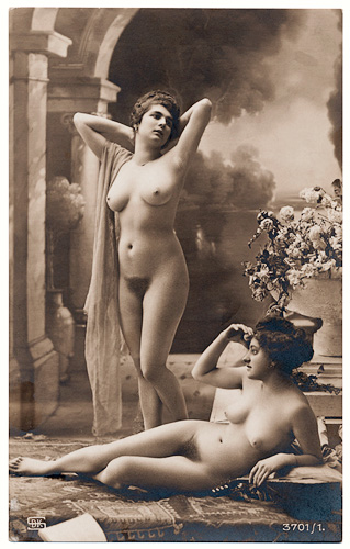 Some of the French Postcards are in a more naturalistic style like classical paintings, and they got called "Italian Style". The models are usually shown in front of romantic background wallpapers. Props are sometimes just a veil or a thin scarf. The postcards don't show the typical erotic character of the French Postcards.